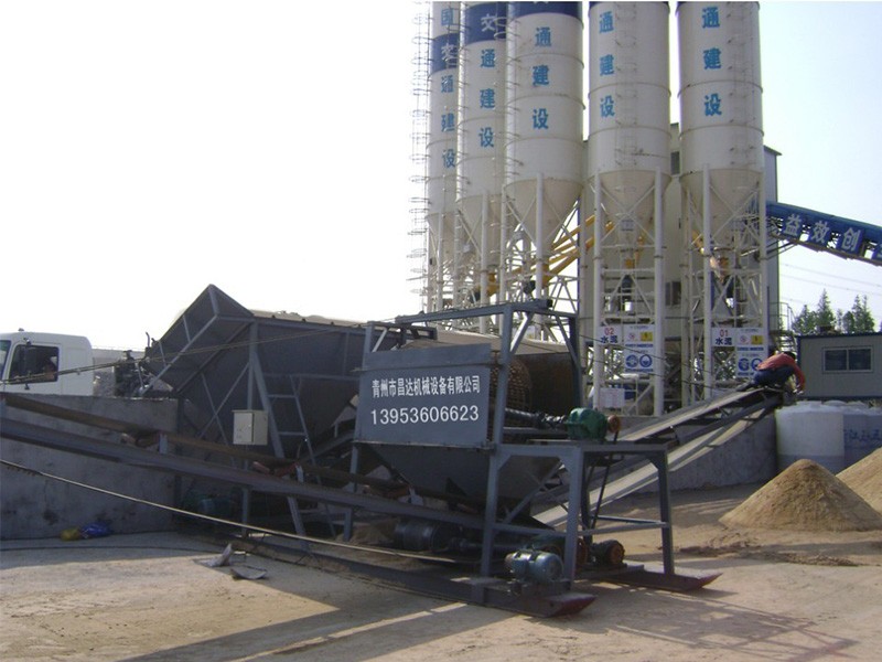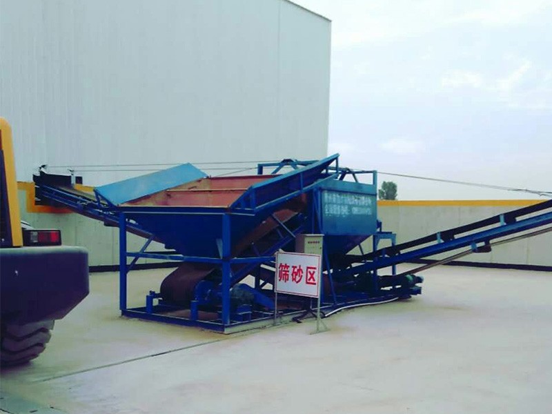 整個設備由原料儲料斗、原料供料皮帶機、平置篩網、成品砂堆料皮帶、棄石出料槽等組成,設備通電運轉后由裝載機將原料裝入大容量儲料斗,原料經由供料皮帶投入到平置篩筒,旋轉的篩筒帶動原料在筒內葉片的推擠、翻滾下形成原料在篩網面滑滾的人工篩砂效果,篩出的成品砂通過集料斗落在成品砂皮帶上,同時被皮帶提升落下呈成品料堆、或直接落入儲料斗,整個過程連續且物料分級清楚。